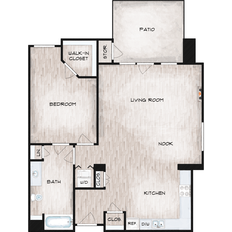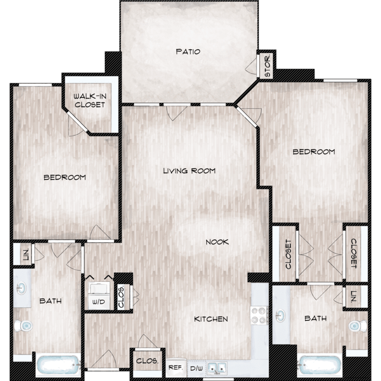 Drew Court is pleased to offer one, two, and three-bedroom apartments for rent. Our spacious floor plans include 10-foot ceilings, recessed lighting, stainless steel appliances, quartz countertops, hardwood-style vinyl planking, washers and dryers, and a balcony or patio. Select homes include gas fireplaces and walk-in closets. Each of our floor plans is designed with luxury and your comfort in mind. At Drew Court, we strive to make all of our residents feel pampered and at home.